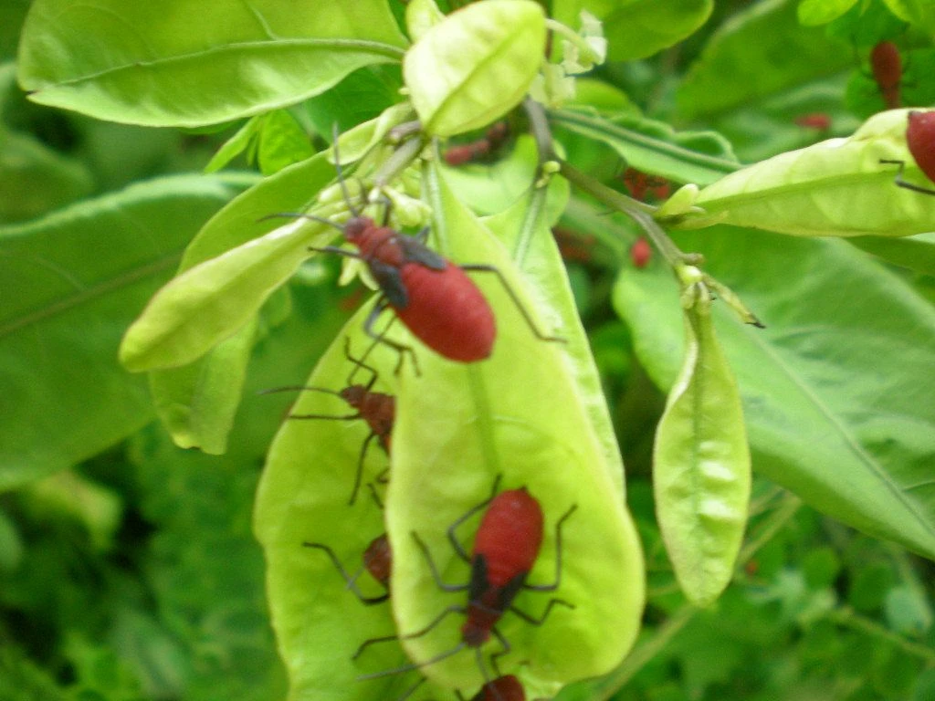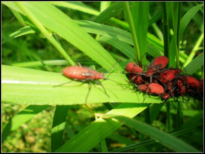 這些紅色小蟲,喜愛群聚生活,屬半翅目 姬緣椿象科 ,喜歡吸食台灣欒樹的種子(椿象口器是刺吸式,刺入植物莖或種子內吸食汁液)。